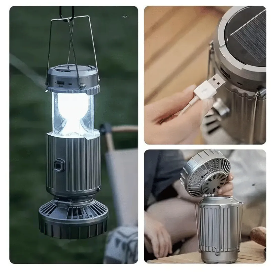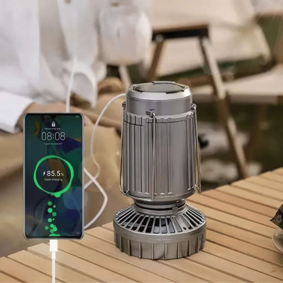 يعمل كمروحة، لامبة، وباوربانك بنفس الوقت! يمنحك هواء بارد في الأيام الحارة، ينير المكان بنور قوي وواضح، ويشحن هاتفك أيضًا.