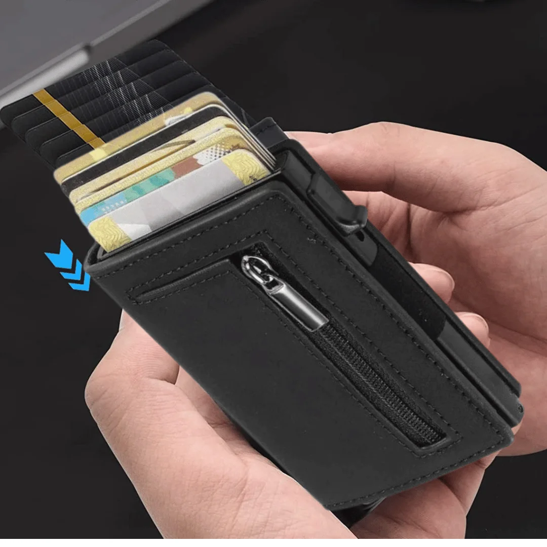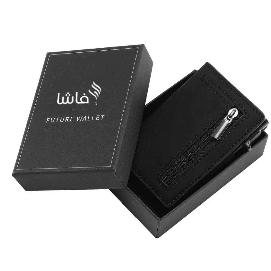 تتميز بمساحة وافرة لحمل جميع البطاقات الخاصة بك ، الاوراق النقدية ، العملات…الخ كل ذلك مع الحفاظ على المظهر اللطيف للغاية لكي يلائم الجيب لجميع الازياء التي ترتديها كما يتيح لك زر فوري مصمم لاخراج البطاقات بسرعة و بلمسة زر واحدة.